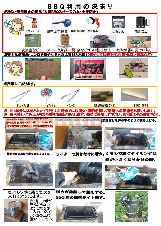 ● 室内での焼肉等は禁止です。 BBQオプションにはテーブル・コンロ・火ばさみ・トング・木炭・焼網・焚付・軍手・蚊取線香の皿など利用できます。